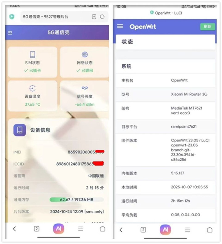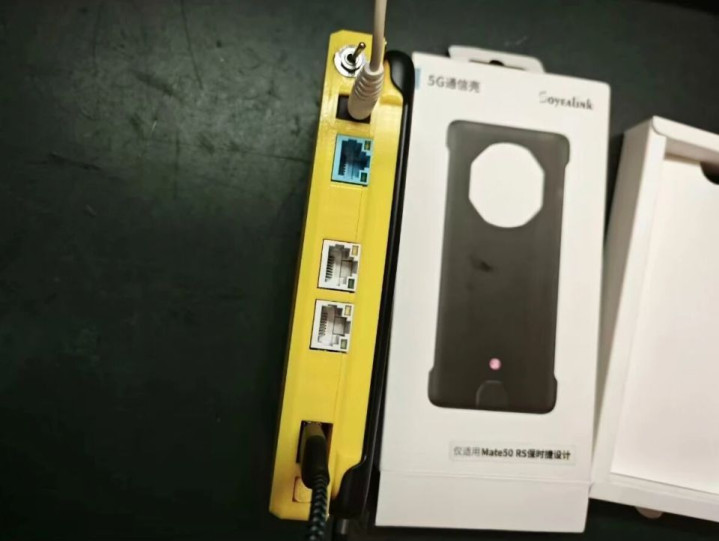 然后将华为5G通信壳跟3D打印的黄色外壳“合体”,就可以得到一个5G CPE设备。由于事先将小米RG3路由器刷了OpenWrt系统,并配置好了USB设置,所以通电即用,不用折腾。