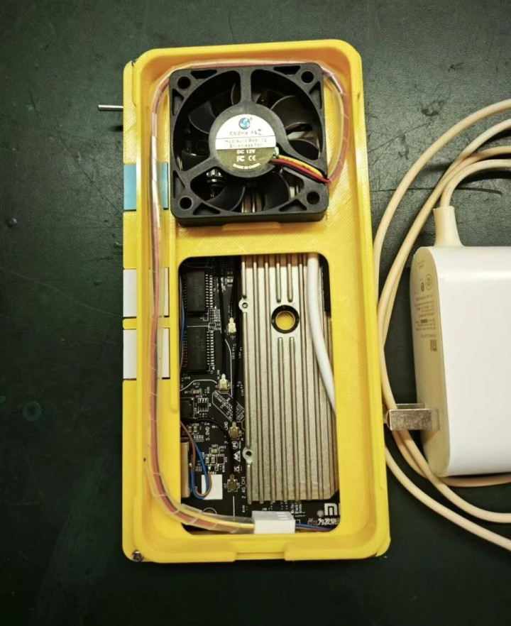 那么大神是如何用5G通信壳改造的?首先需要用3D打印机制作一个黄色的外壳,再将小米R3G路由器的主板等核心元件放进黄色外壳中,里面的尺寸肯定是事先测量过的,侧面还预留了网线等开槽。